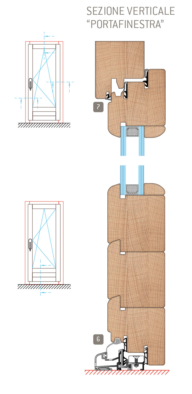 Alcune sezioni del serramento Alaska con vista verticale e orizzontale della finestra e della portafinestra.