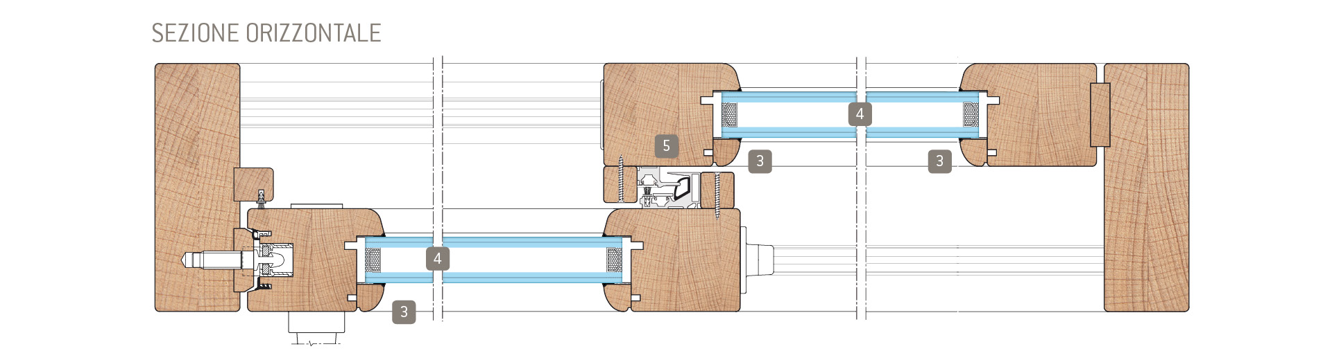 Alcune sezioni del serramento Alzante Scorrevole Intermedio con vista verticale e orizzontale della finestra e della portafinestra.